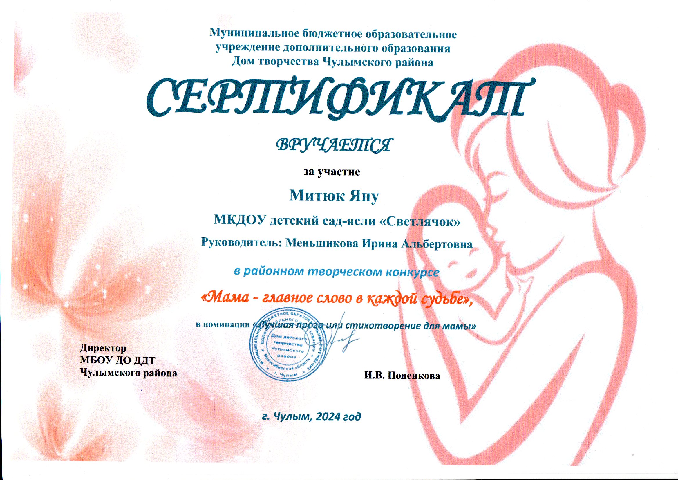 Митюк Ян - Сертификат за участие в районном творческом конкурсе "Мама-главное слово в каждой судьбе в номинации "Лучшая проза или стихотворение для мамы"