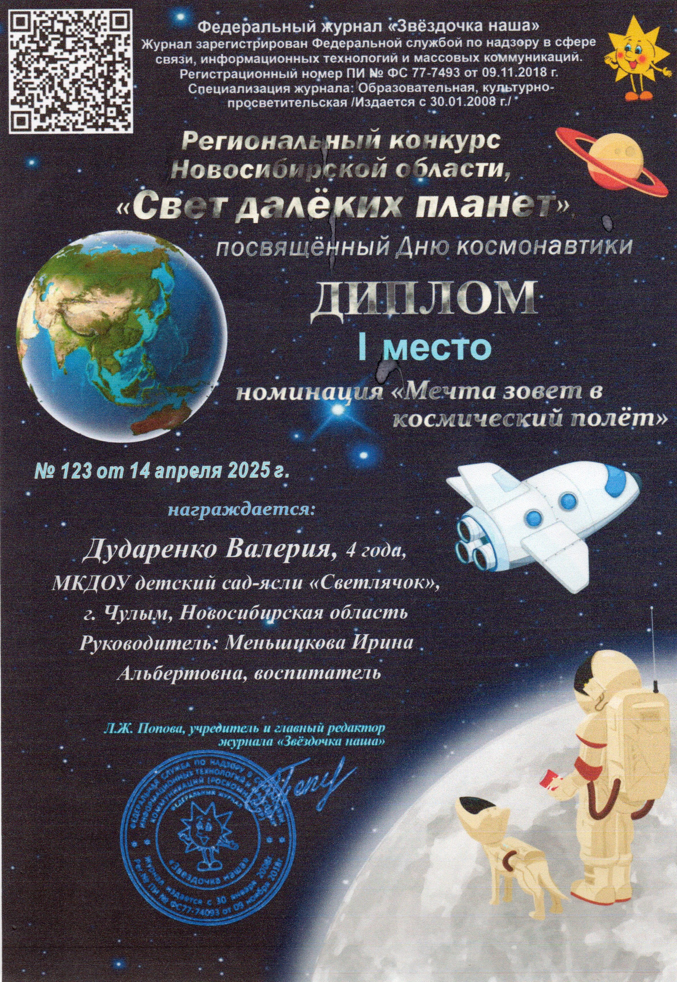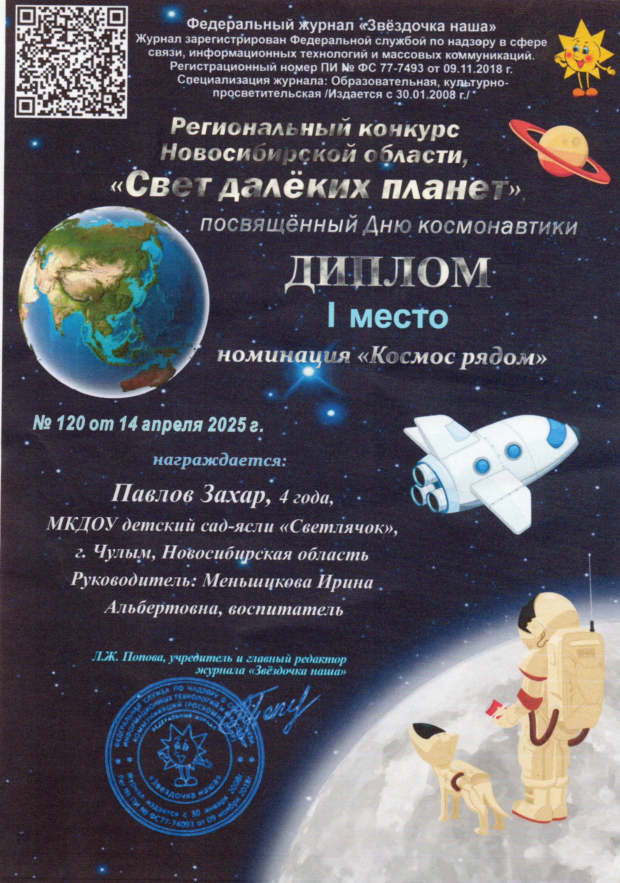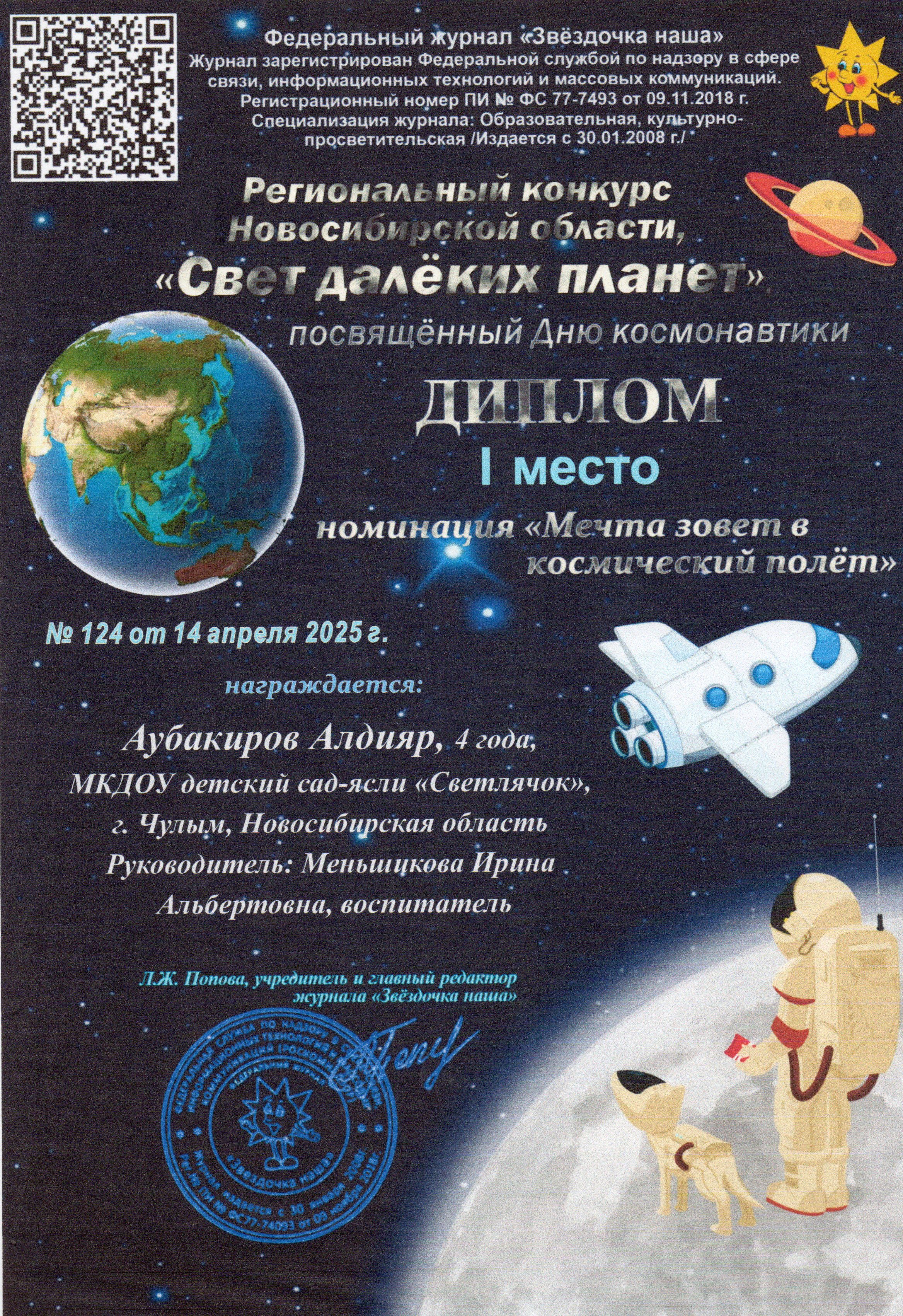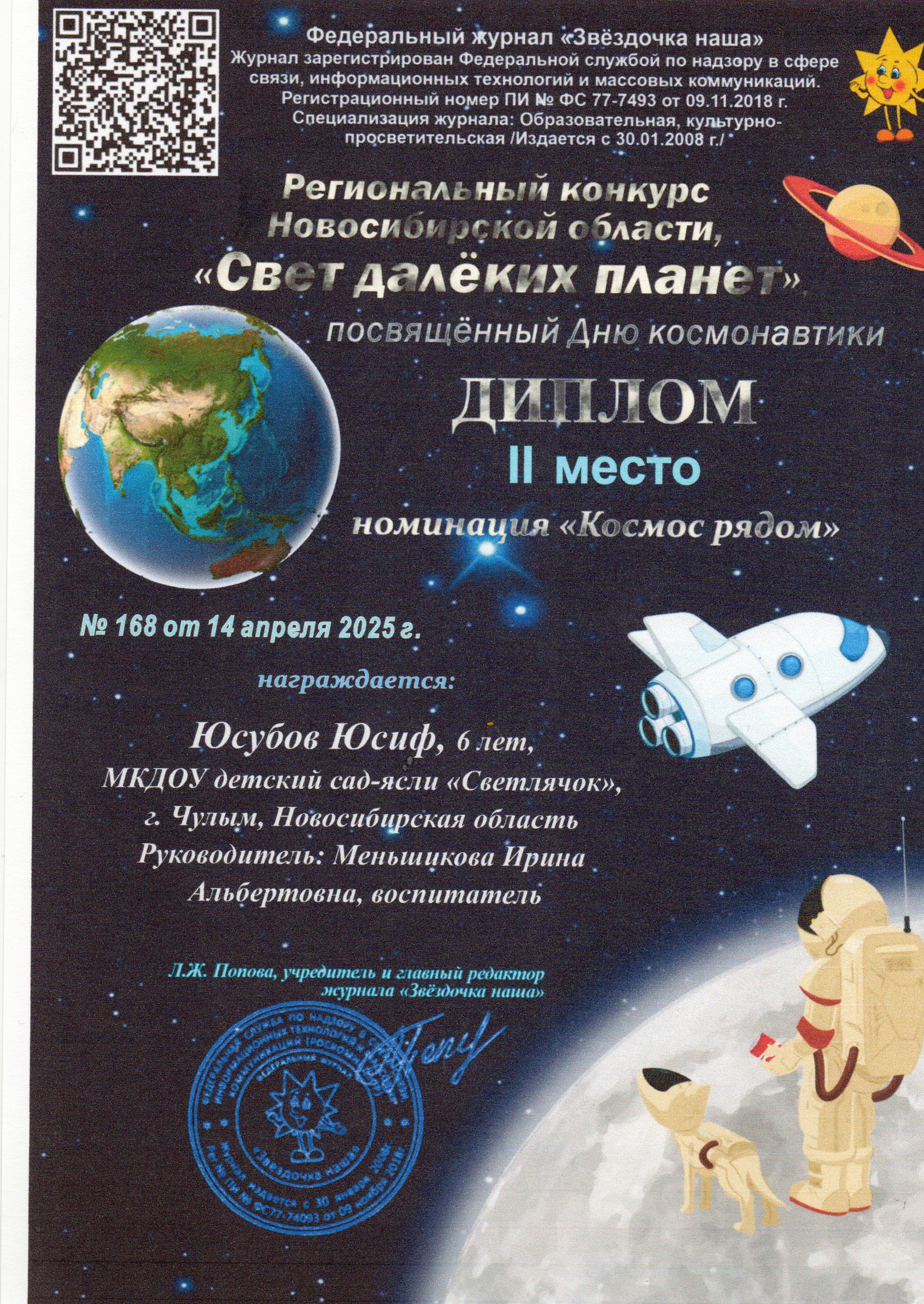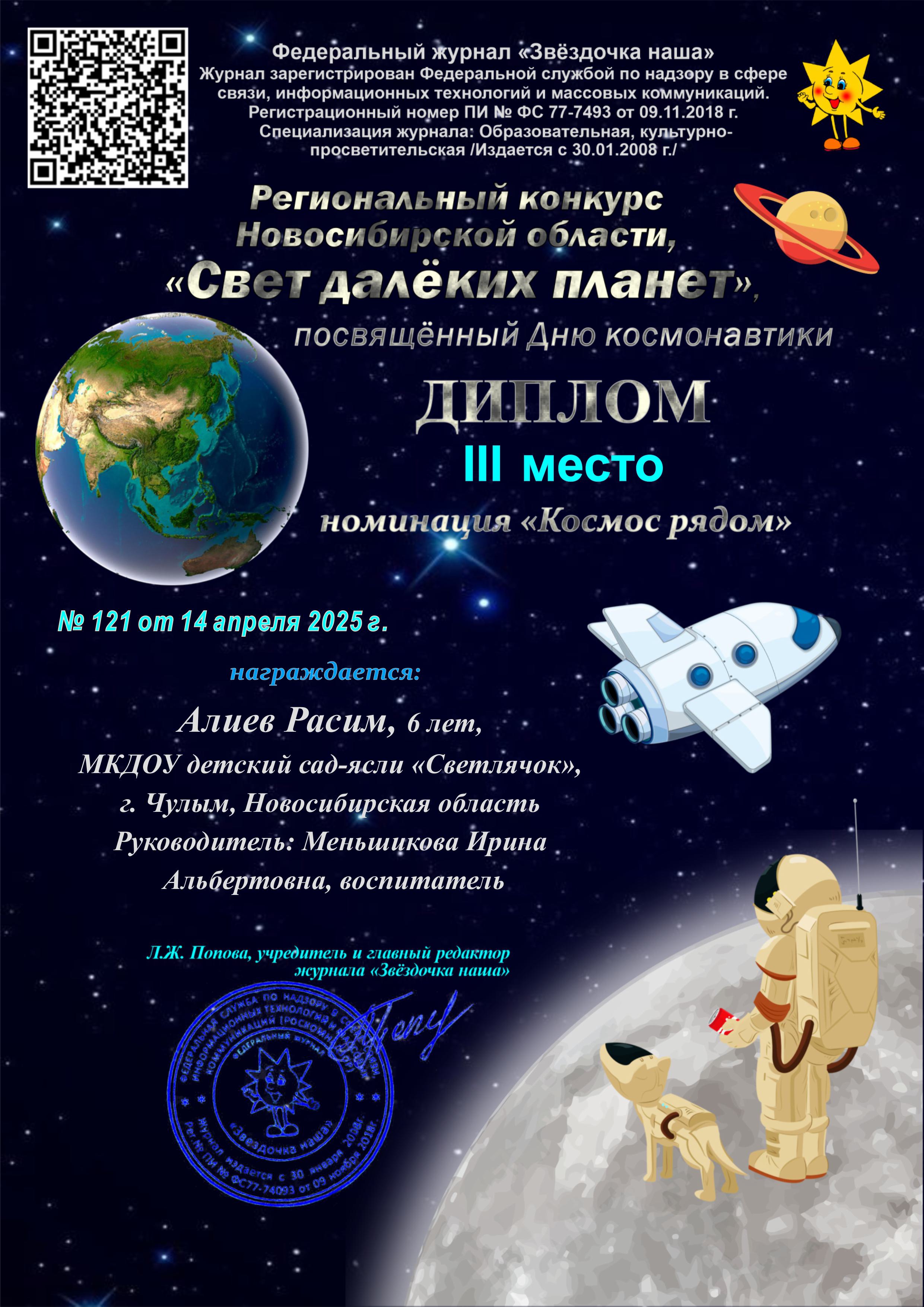 В номенации "Космос рядом" Юсубов Юсиф Диплом 2 место, Павлов Захар Диплом 1 место, Алиев Расим Диплом 3 маесто, В номенации "Мечта зовёт в космический полёт"