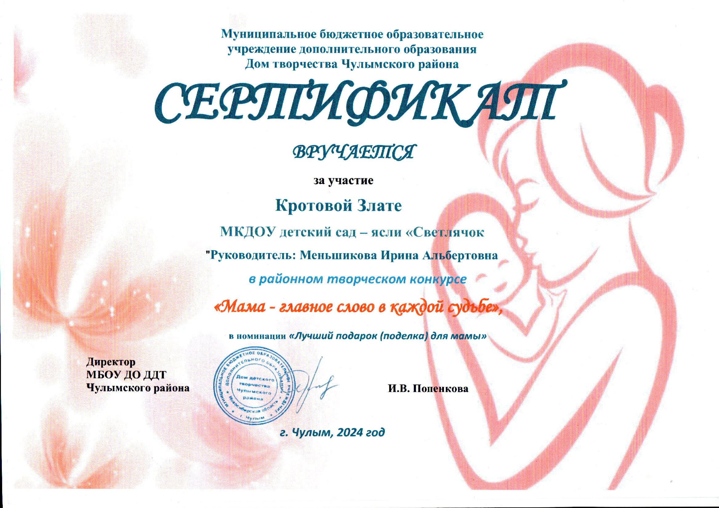 Кротова Злата - Сертификат за участие в районном творческом конкурсе "Мама-главное слово в каждой судьбе в номинации "Лучший подарок (поделка) для мамы"