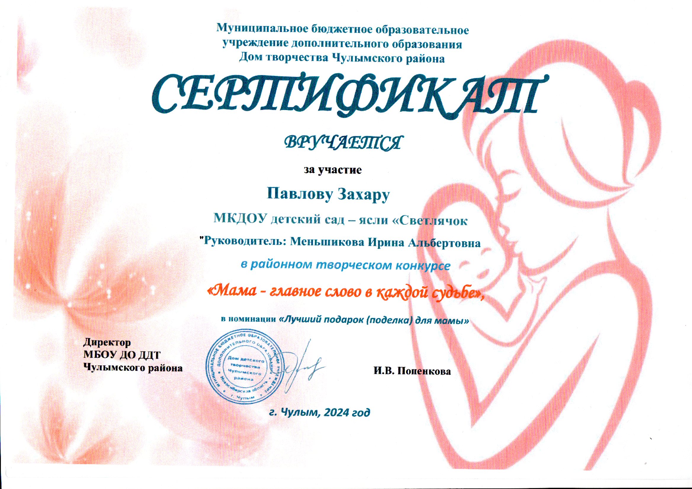 Павлов Захар - Сертификат за участие в районном творческом конкурсе "Мама-главное слово в каждой судьбе в номинации "Лучший подарок (поделка) для мамы"