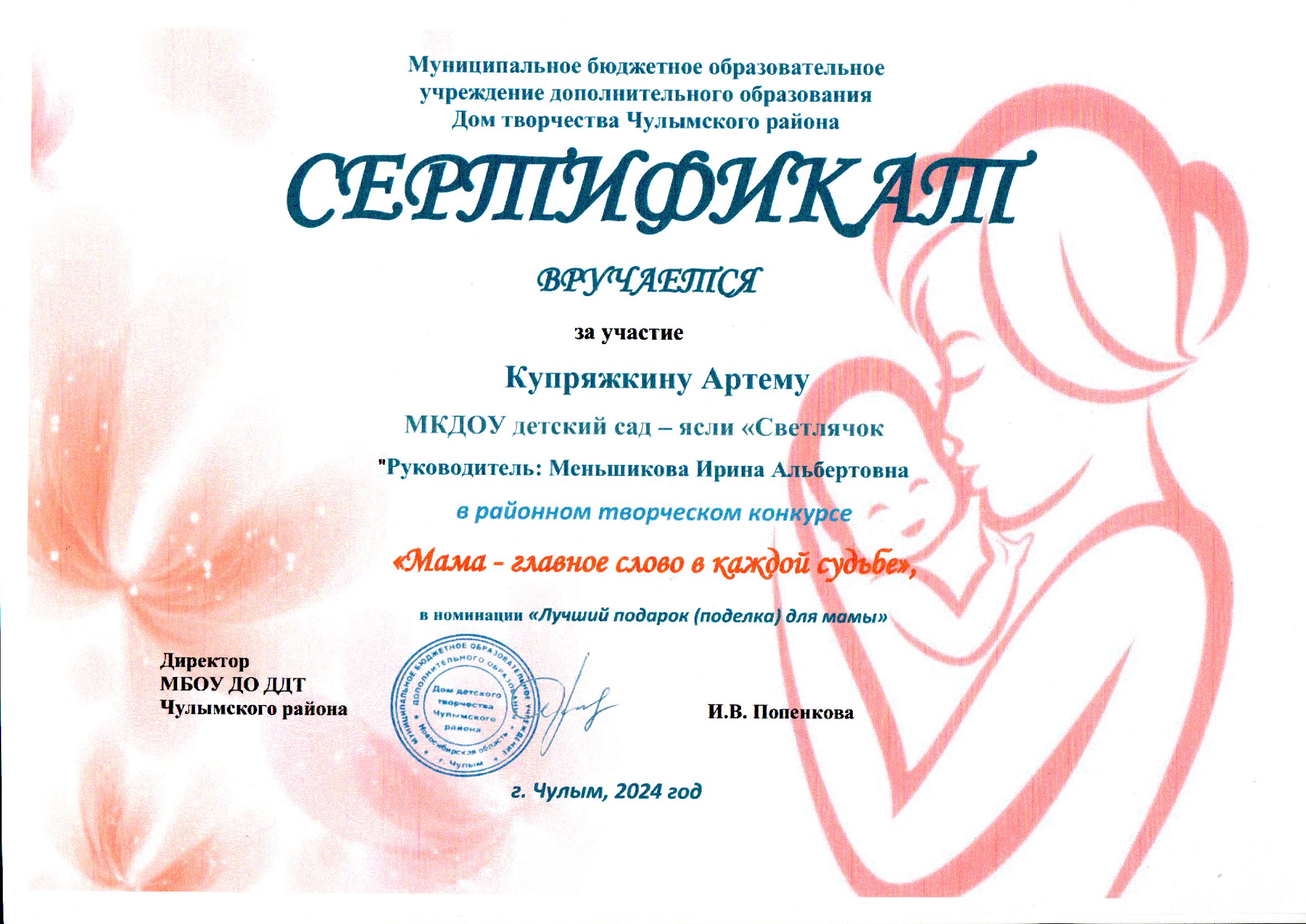 Купряжкин Артём - Сертификат за участие в районном творческом конкурсе "Мама-главное слово в каждой судьбе в номинации "Лучший подарок (поделка) для мамы"