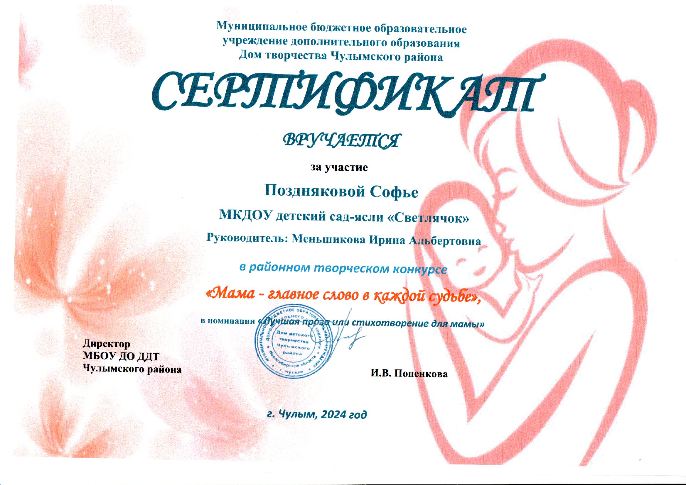 Позднякова Софья - Сертификат за участие в районном творческом конкурсе "Мама-главное слово в каждой судьбе в номинации "Лучшая проза или стихотворение для мамы"