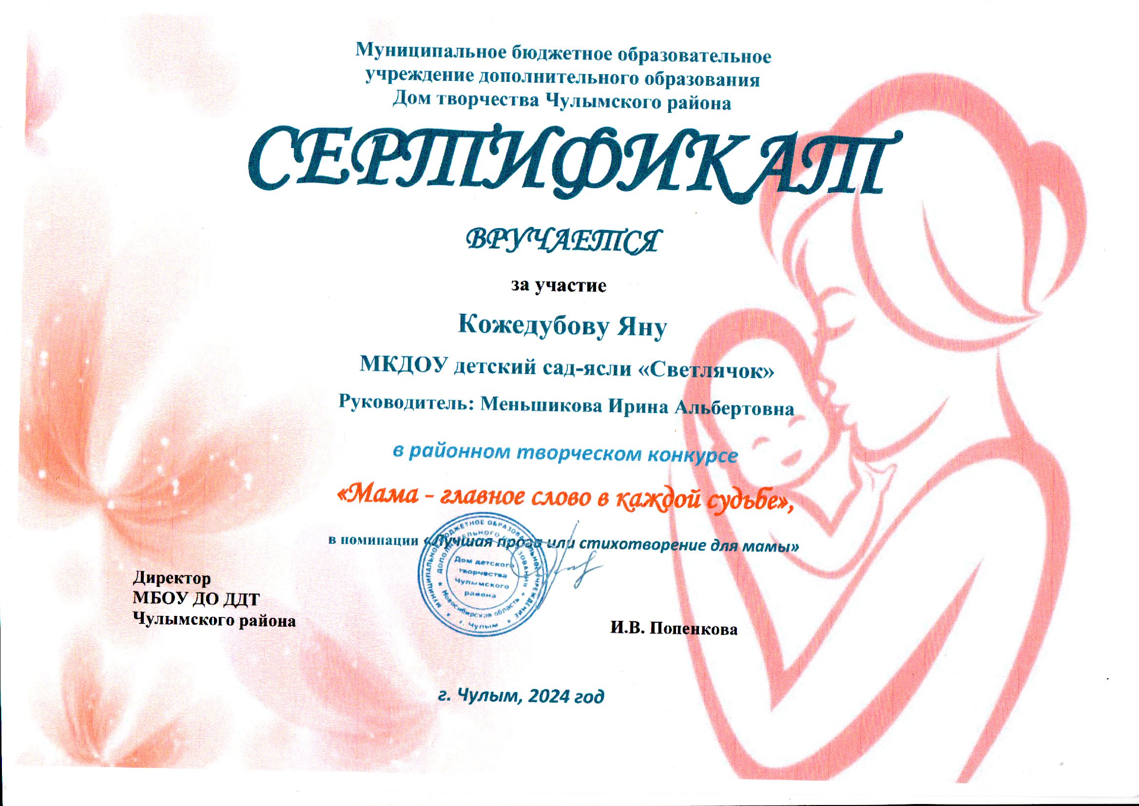 Районный конкурс среди дошкольных образовательных организаций Чулымского района «Мама - главное слово в каждой судьбе», посвящённого Всероссийскому Дню Матери в номинации «Лучшая проза или стихотворение для мамы»