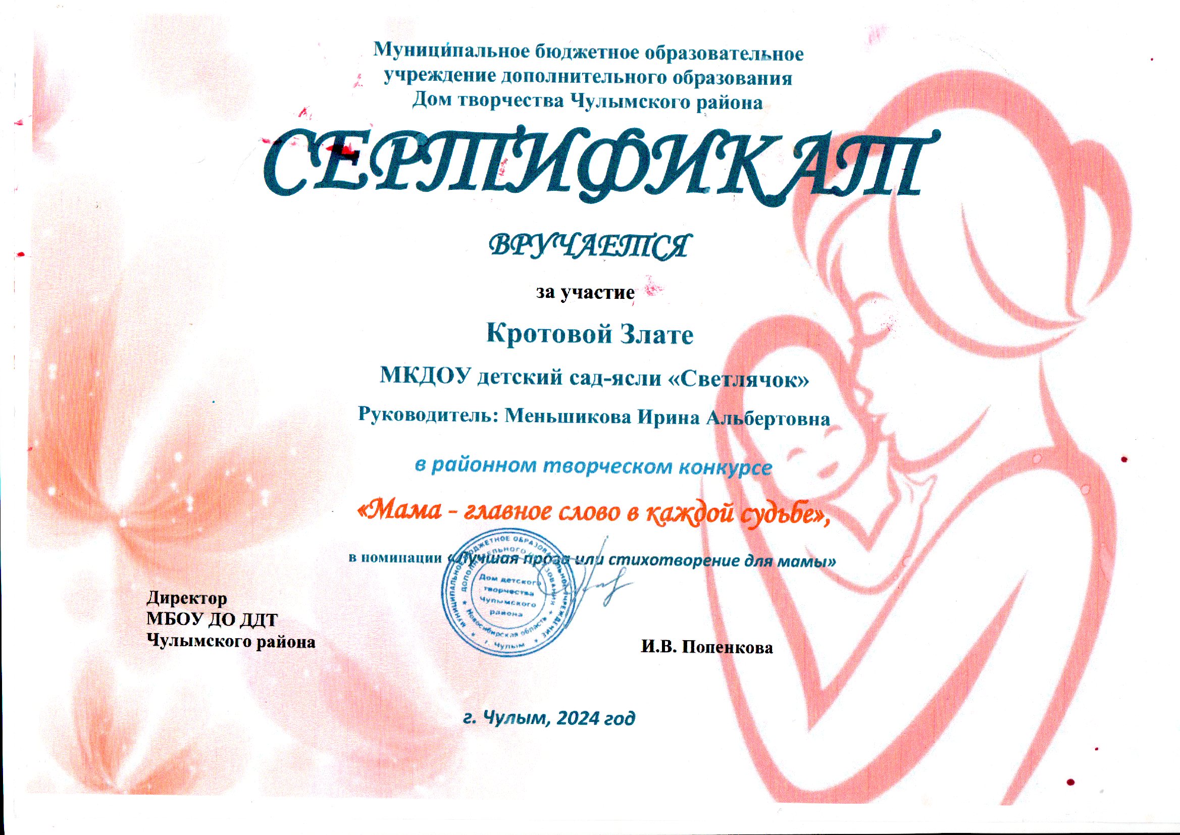 Кротова Злата - Сертификат за участие в районном творческом конкурсе "Мама-главное слово в каждой судьбе в номинации "Лучшая проза или стихотворение для мамы"